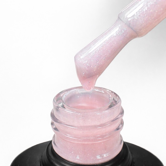 Liquid Extension Glowcrush is a milky builder gel in a bottle – but not your average one. The soft pink-white base is infused with fine silver glitter that reflects light like crushed diamonds. The result is a subtle yet glamorous shimmer that elevates any set, from bridal nails to everyday luxury.