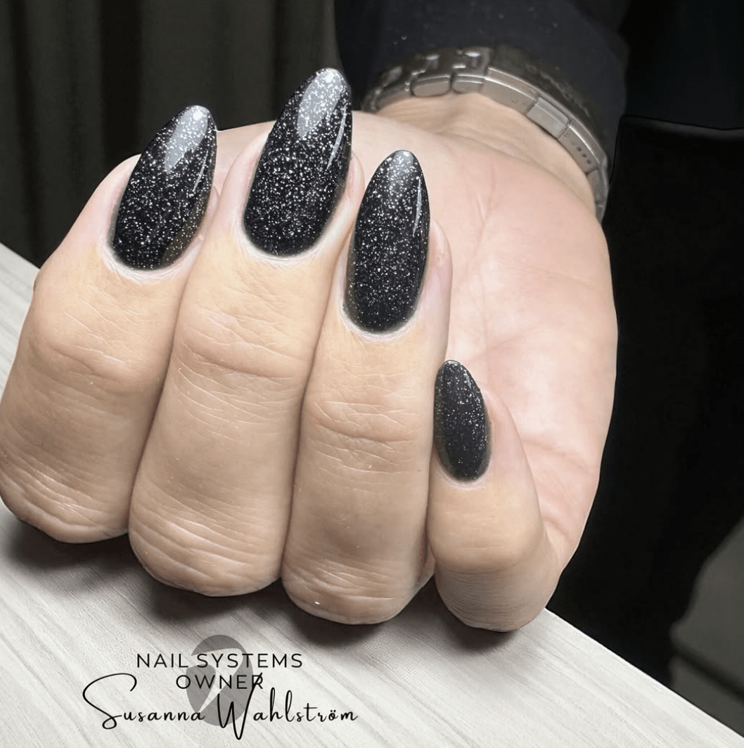 Diamond Knight Gel Polish is a full-coverage black gel polish packed with sparkling glitter. It’s easy to apply, goes on smoothly, and delivers a long-lasting result. Perfect when you want nails with a true wow effect.