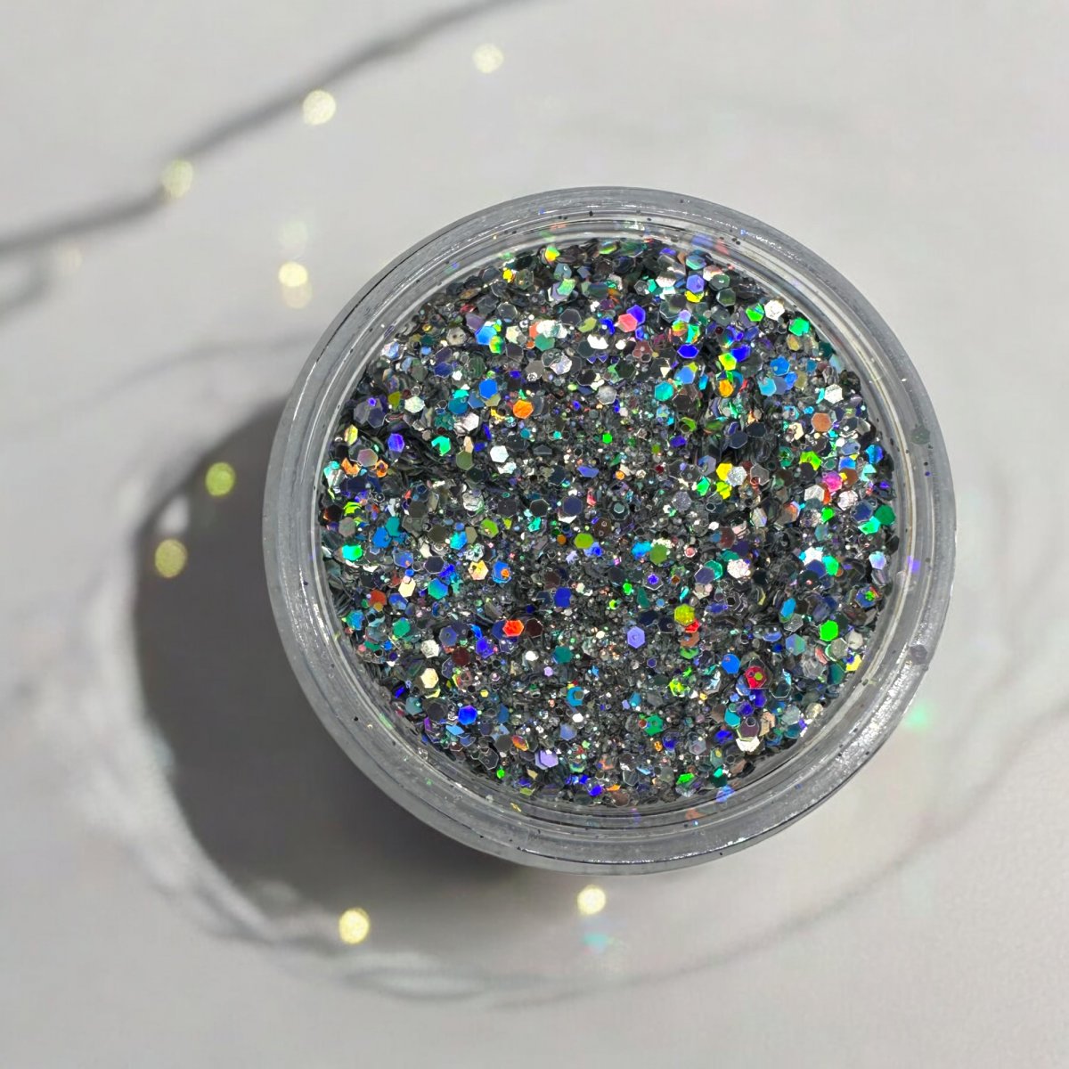Glit-Mix Holo Silver Storm is an intensely sparkling silver glitter with a holographic rainbow effect that reflects light in every direction.
