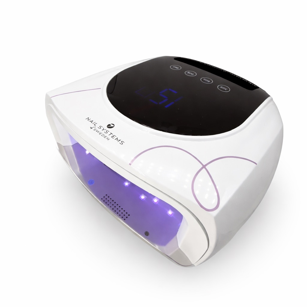 Med dubbel våglängd (365–405 nm) ger lampan jämn och säker härdning av Nail Systems gel, Acrygel samt gelpolish. Auto-sensor aktiverar lampan automatiskt när handen placeras i lampan, och de manuella timerlägena 30, 60, 90 och 99 sekunder ger full kontroll under behandlingen.